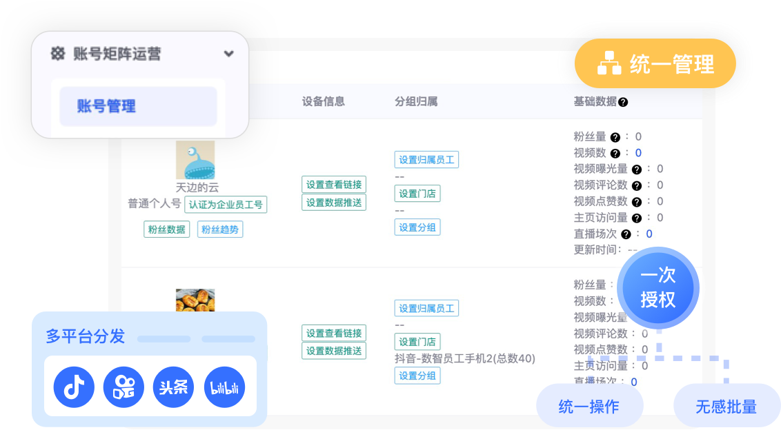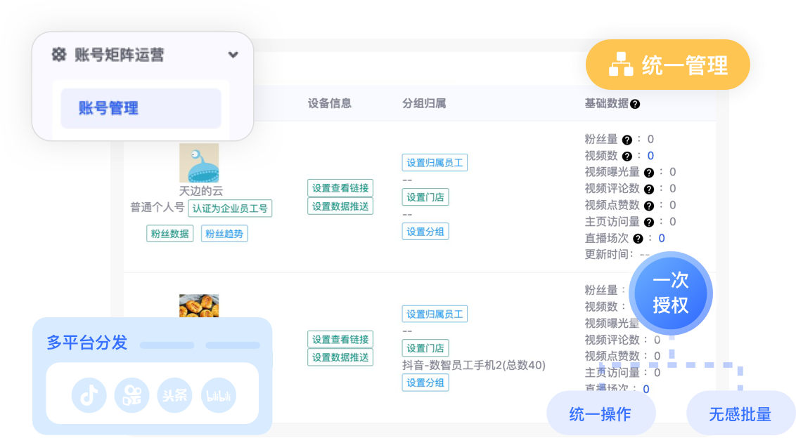 支持抖音、快手、头条、B站等各大主流短视频平台个人号、企业号、达人号等1000 +账号的批量发布