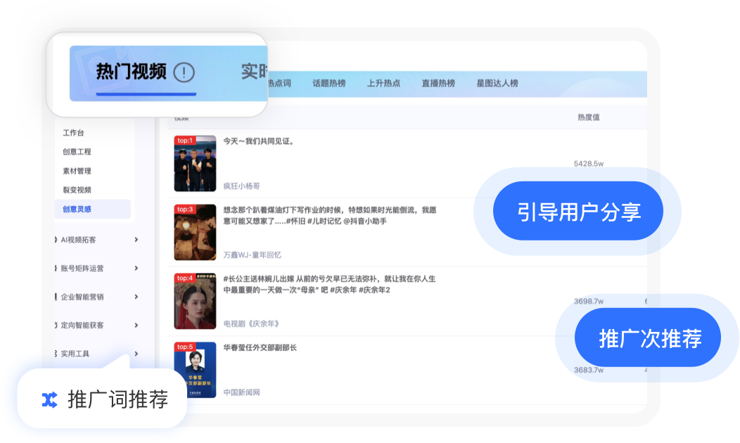 实时显示抖音热门话题排行,可将产品与话题进行结合, 获取更好的展示效果
