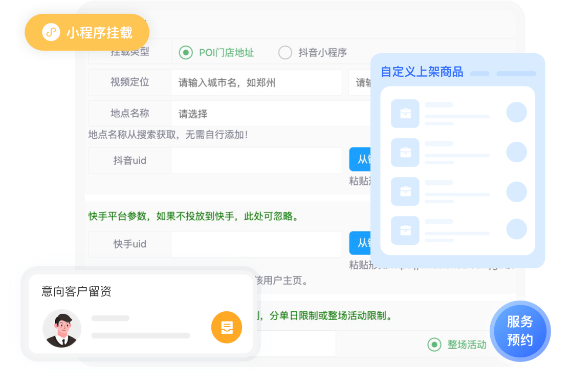 可针对拥有抖音开放平台支付能力的小程序,在后台自定义上架商品,实现小程序内产品体验的服务预约