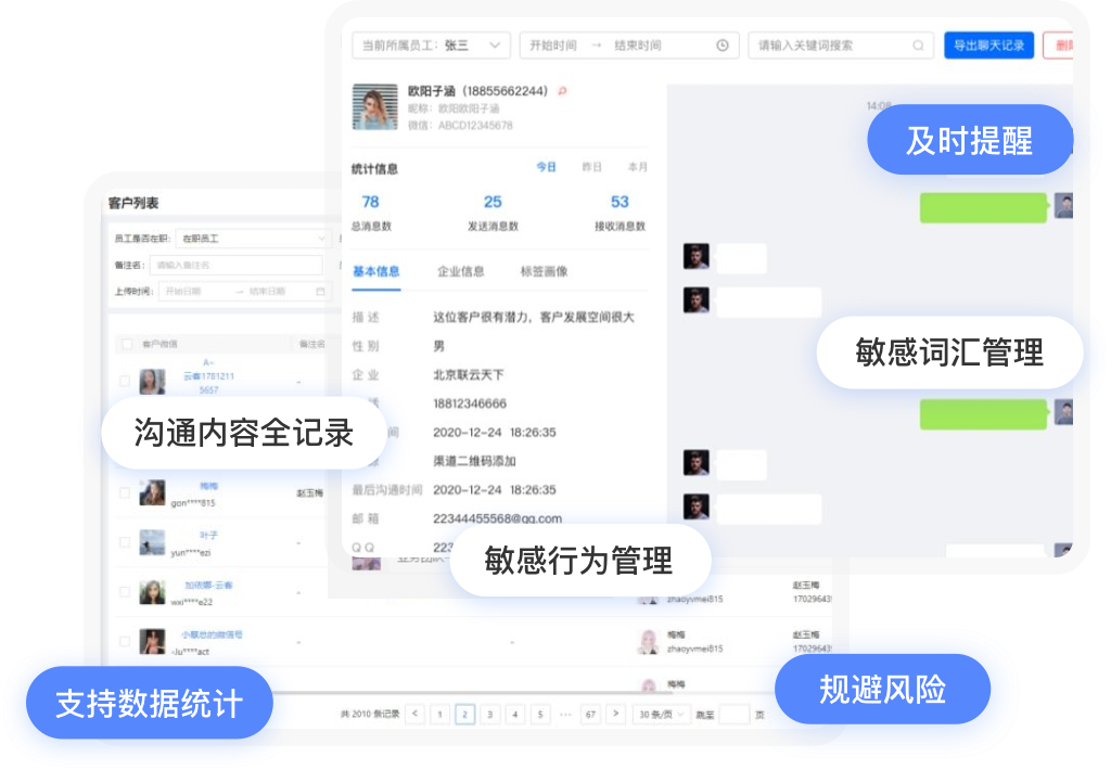 检测辱骂客户、夸大承诺等敏感词,自动删除,自动记录统计