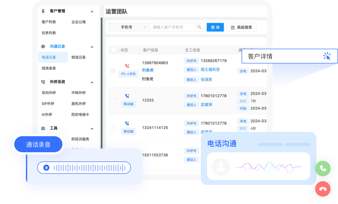 所有电话都将自动录音,并上传云端保存,管理者可随时复听沟通内容