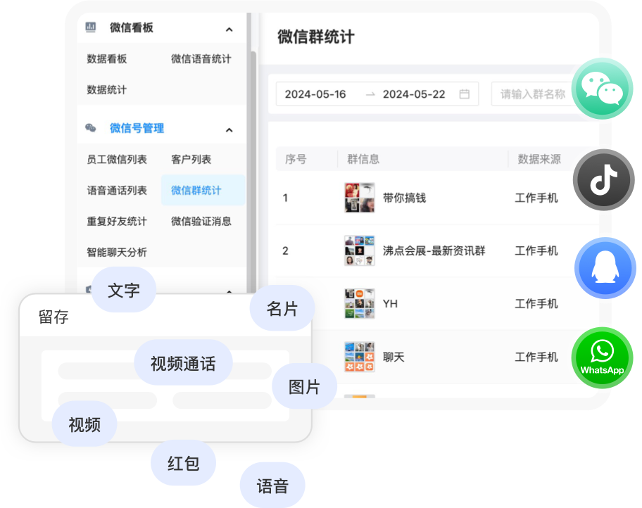 支持微信、抖音/极速版、QQ、WhatsApp等平台的沟通数据留存