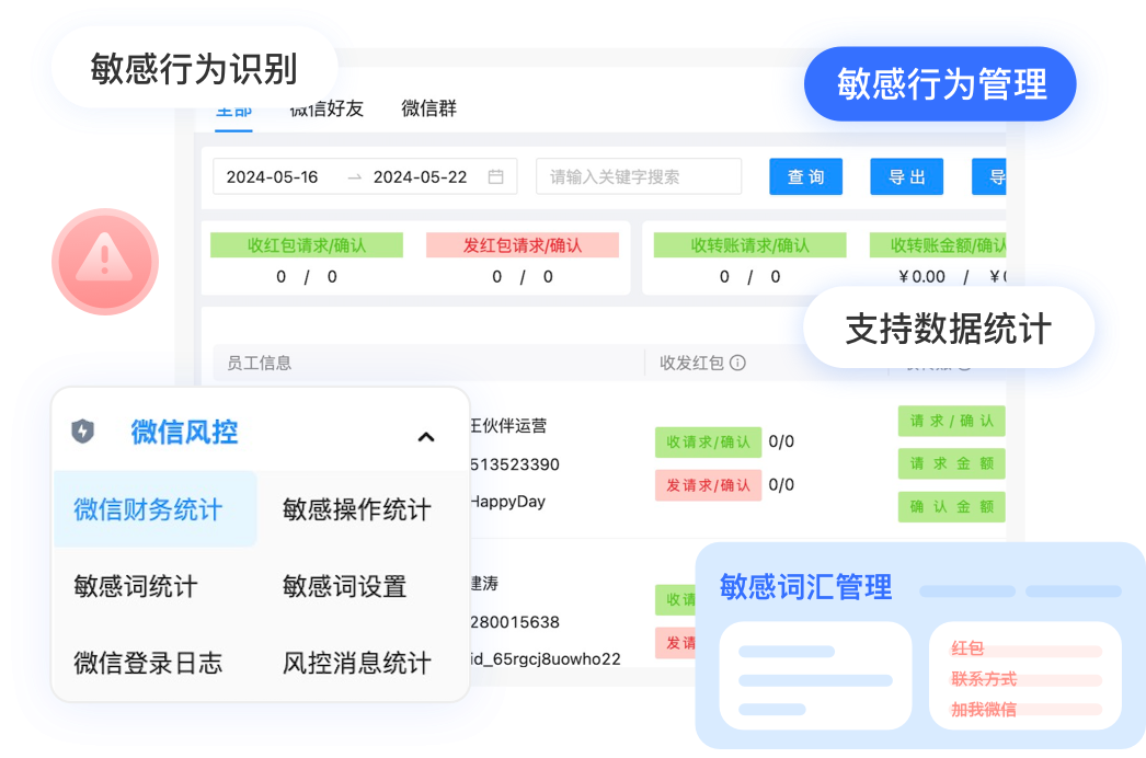 可禁止删除好友、拉黑好友、红包、转账、撤回信息、删除信息、退出登录等行为,出现敏感操作及时提醒,规避风险
