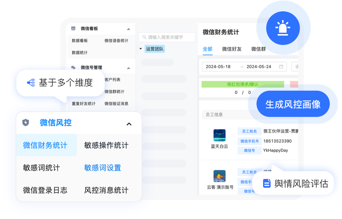可基于沟通数据生成群成员风控画像,对微信群进行定期舆情风险评估