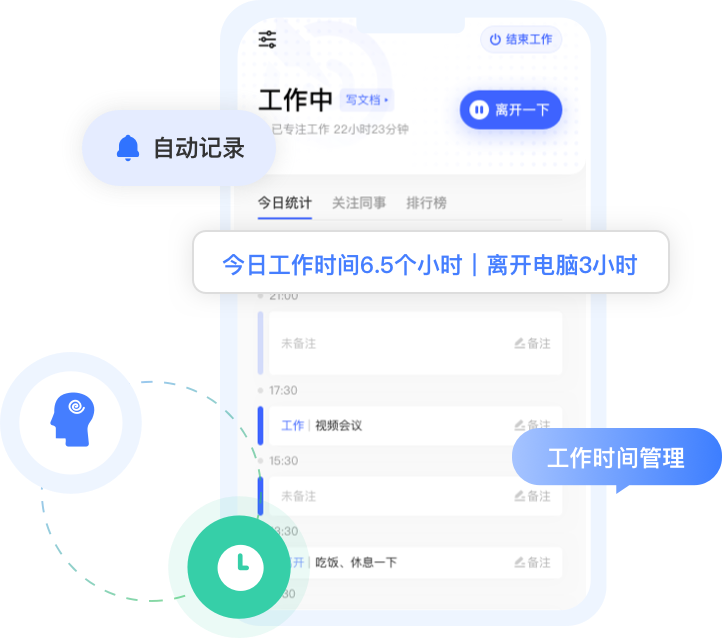 自动记录上班时间、下班时间、离开时间、专注工作时间,准确统计工作时间